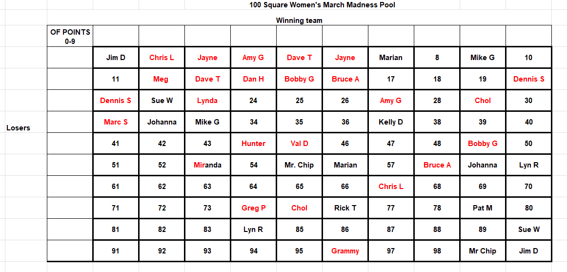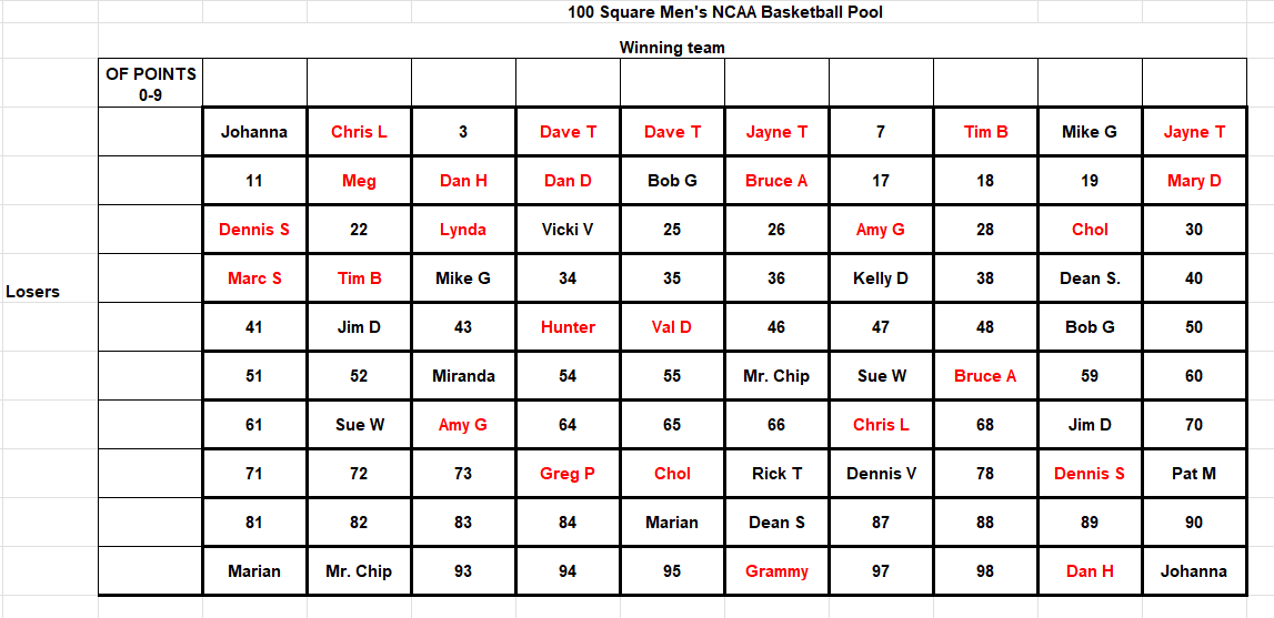 Entry is $20 per square - 63 Games Final Digit of game is winner